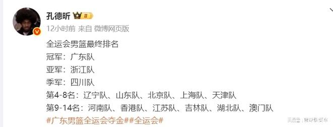 男篮全运最终排名出炉:广东全胜夺冠辽宁第4 浙江创历史纪录