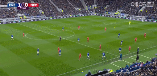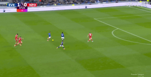 第45+3分钟,埃弗顿前场三打一,恩迪亚耶助攻巴里破门,埃弗顿2-0森林